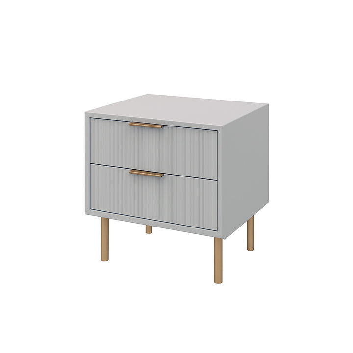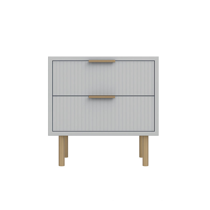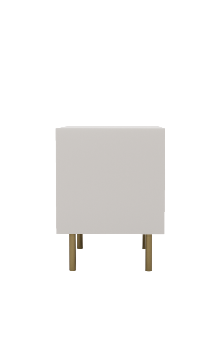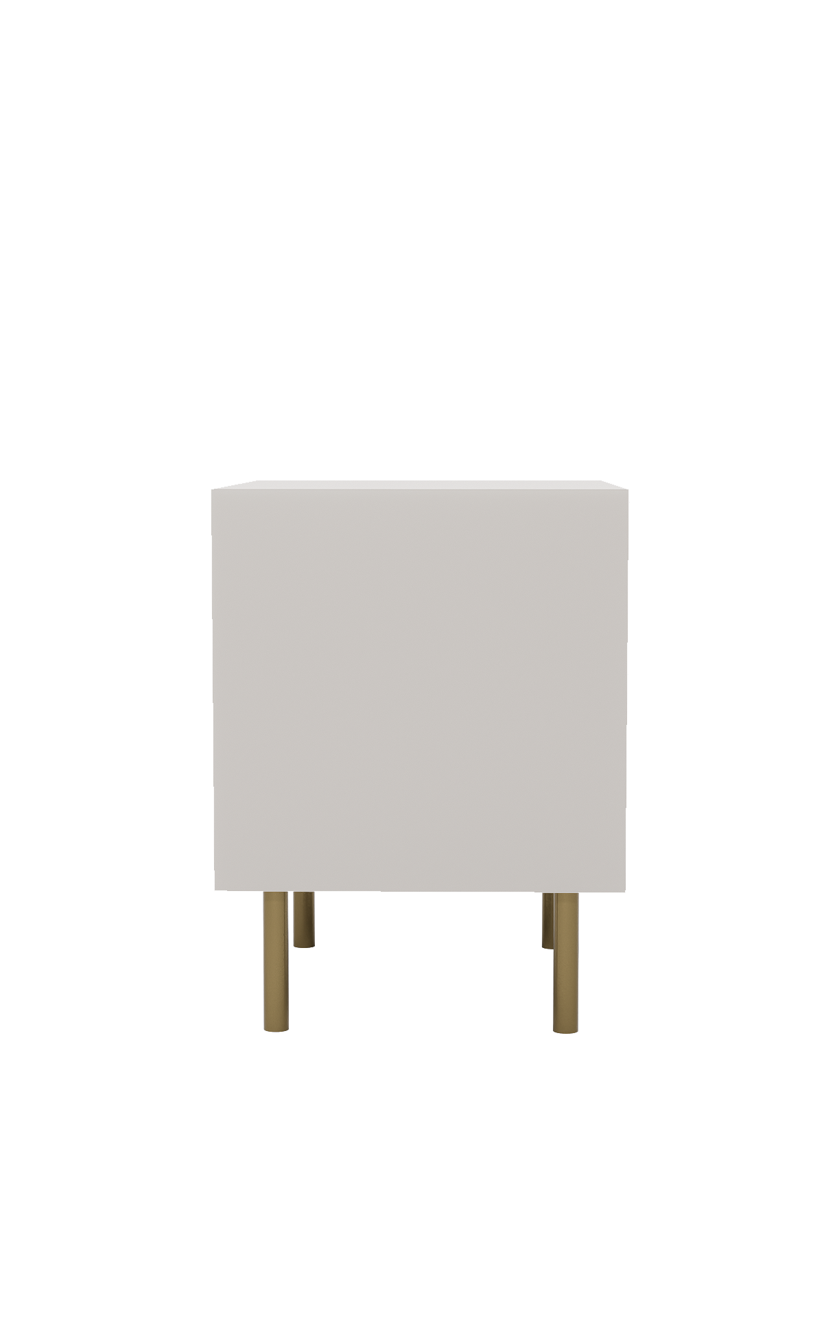 Cuerpo fabricado en MDF con acabado en pintura de poliuretano, disponible en una variedad de colores de nuestro catálogo. Cuenta con jaladeras de acero en elegante tono dorado y patas de herrería que aportan firmeza al diseño. El frente incluye un detalle decorativo con rauteado curvo que añade carácter y sofisticación a la pieza