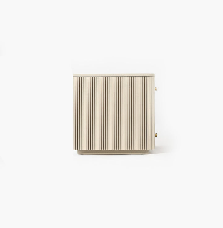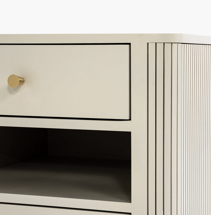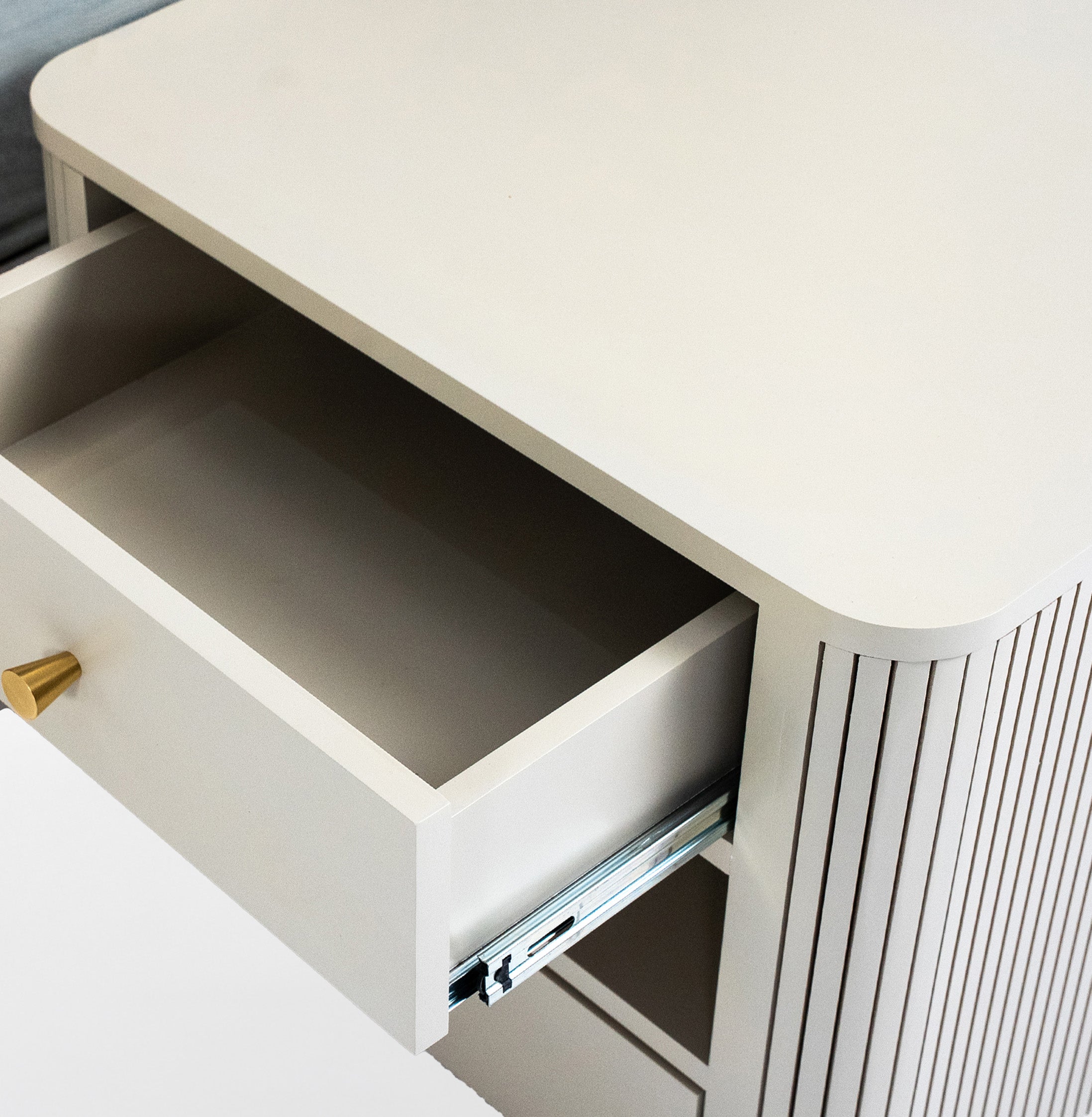 Incorpora una corredora de cierre estándar, que garantiza un deslizamiento funcional y práctico en cada apertura. Sus patas de MDF aportan estabilidad y un diseño homogéneo con la estructura, mientras que las agarraderas de acero añaden un detalle contemporáneo que combina estética y resistencia.