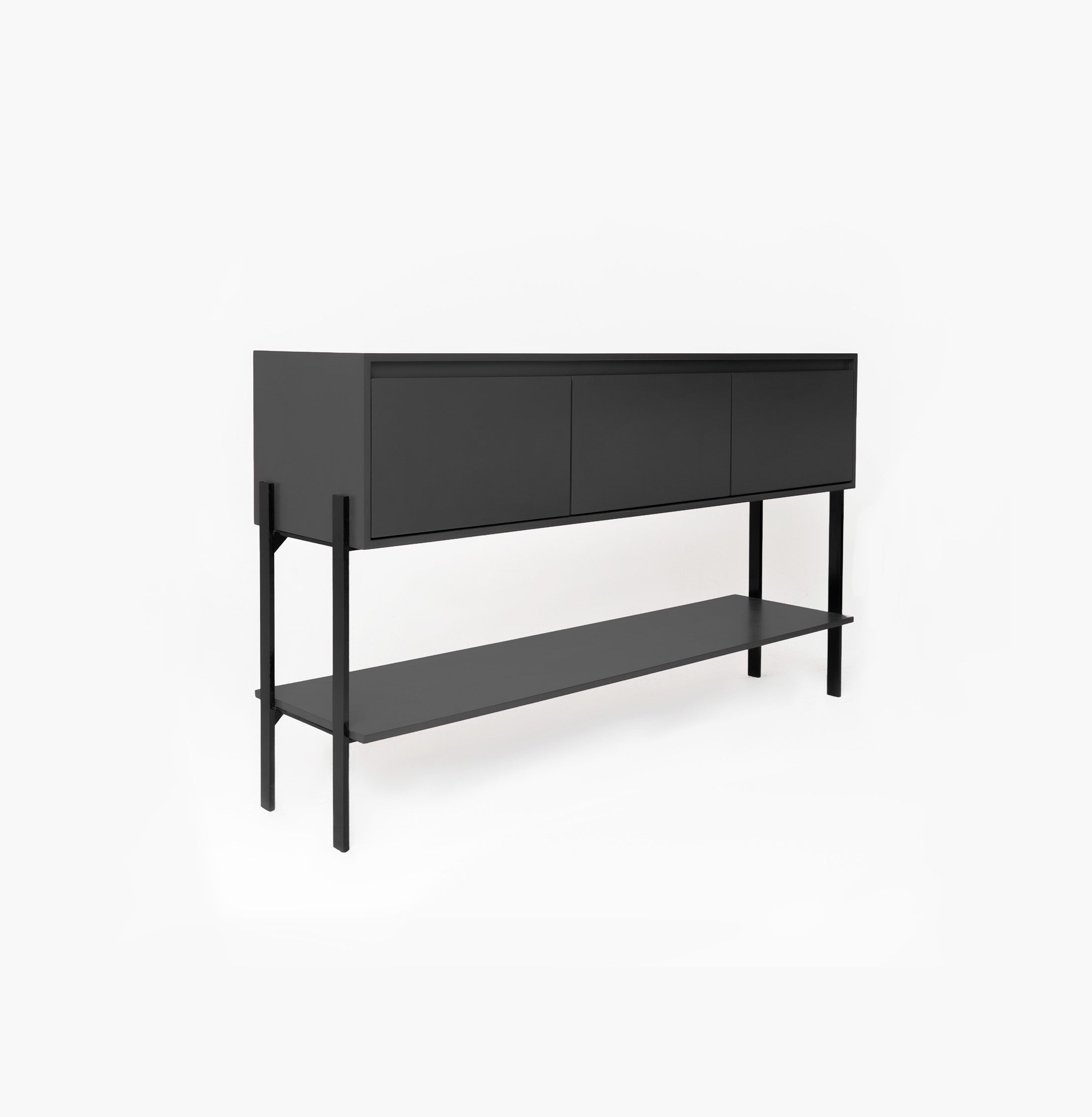 Credenza fabricada con cuerpo de MDF en acabado de poliuretano de alta resistencia, ideal para el uso diario. Equipado con bisagras y herrajes de la reconocida marca Hafele, que garantizan suavidad y durabilidad. Su base está elaborada en estructura de acero PTR de 1", con un elegante acabado horneado en color de elección que aporta solidez y un toque contemporáneo.