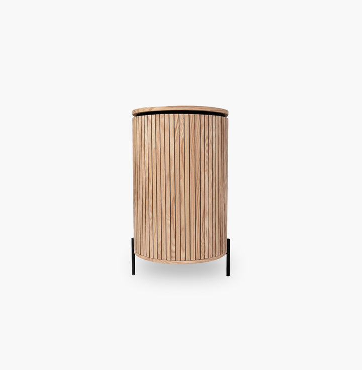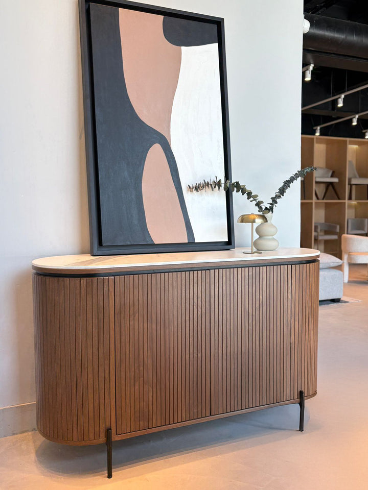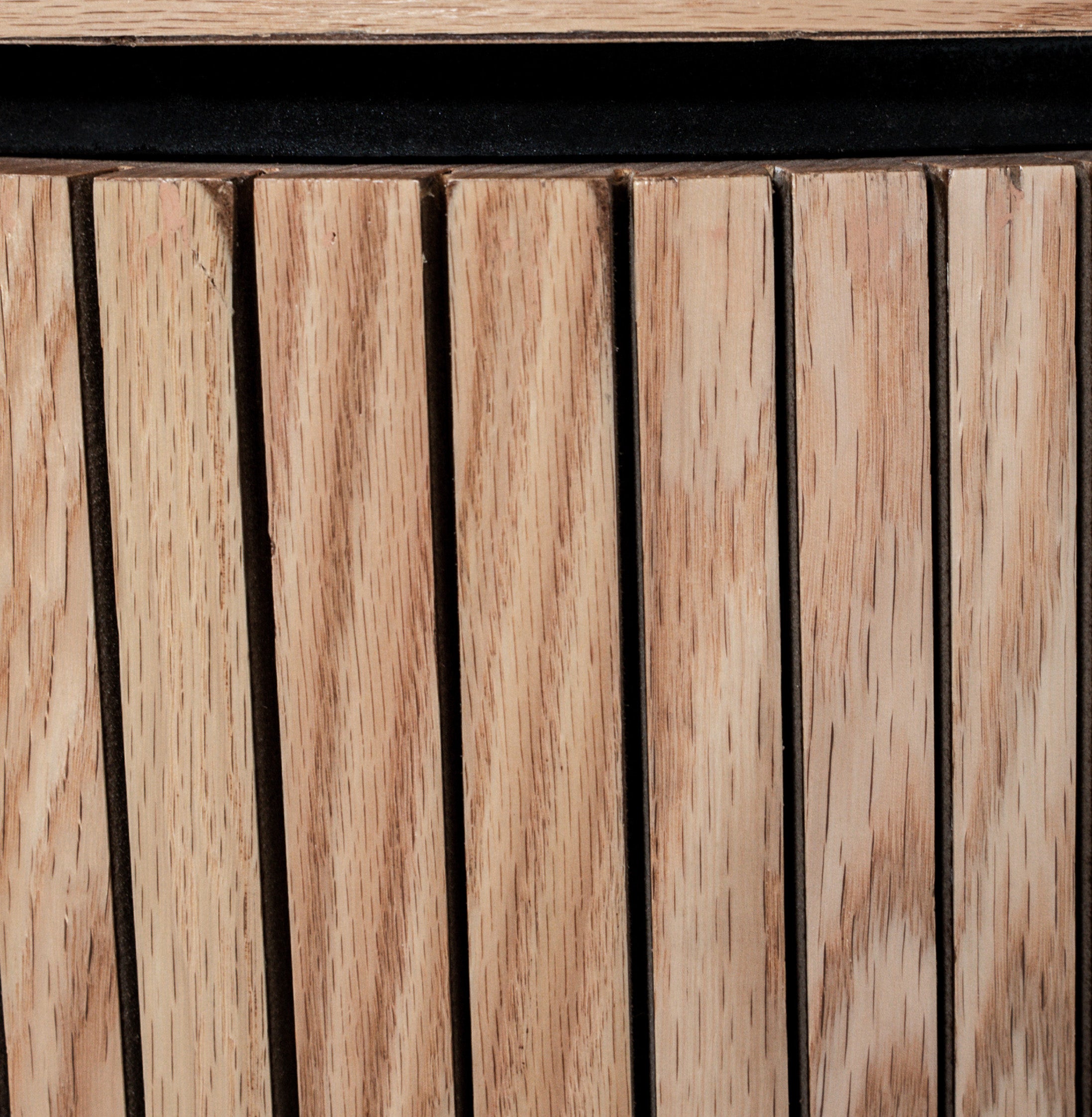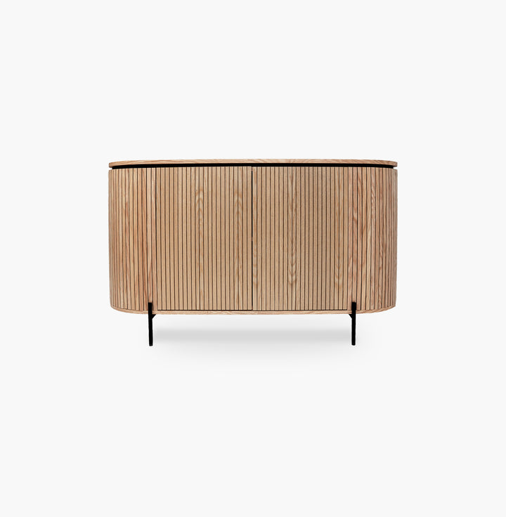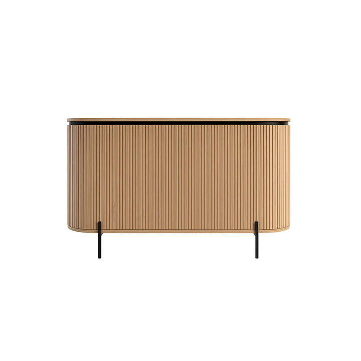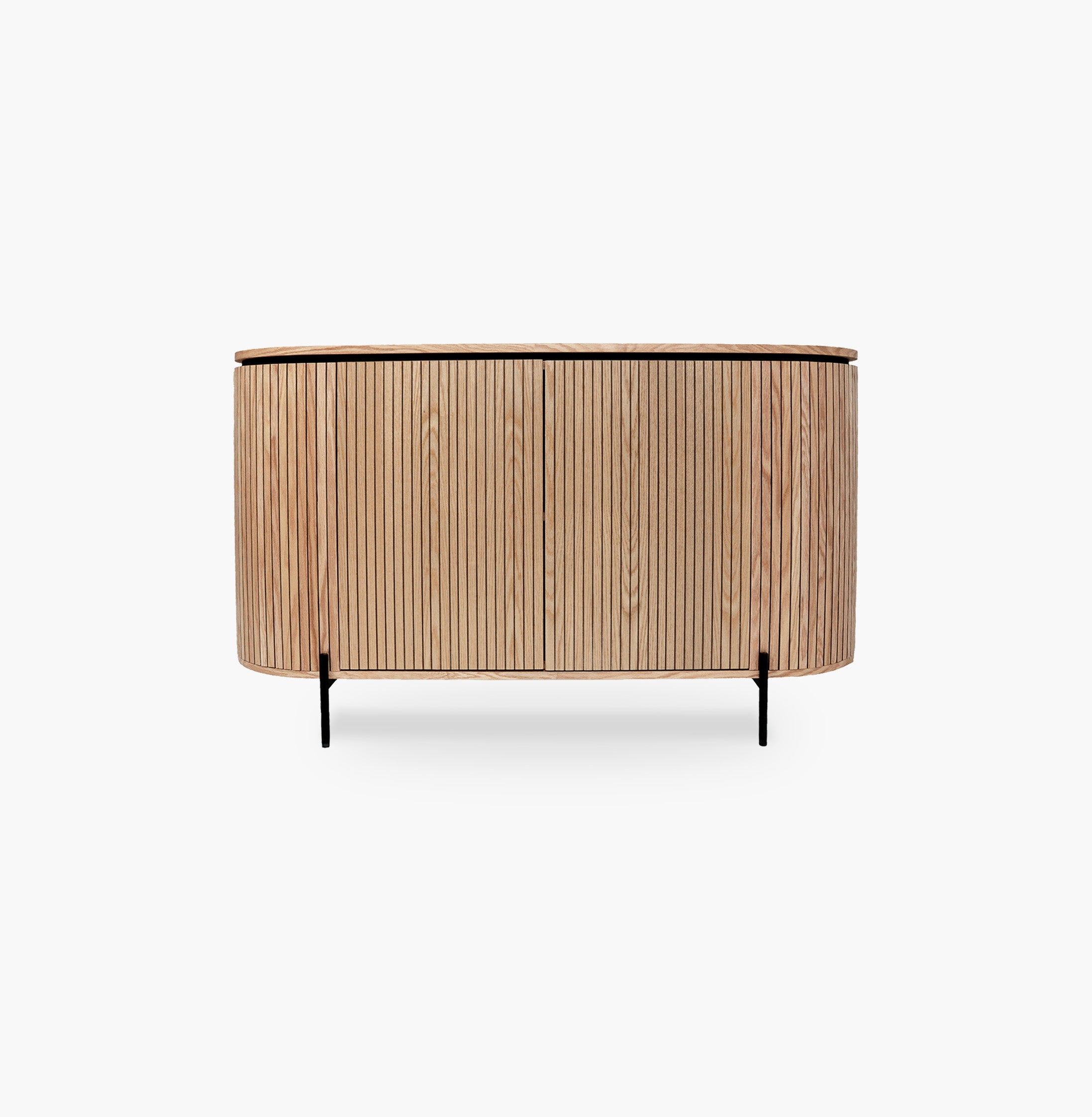Credenza de estilo contemporáneo fabricada en chapa de encino color natural o nogal en diseño de frente estriado en forma de listones verticales, que se prolonga suavemente hacia las esquinas curvas. Cuenta con una estructura sólida apoyada sobre patas metálicas delgadas en color negro, con herrajes marca hafele que elevan la pieza y le otorgan ligereza visual. Su diseño limpio y sofisticado la hace ideal para espacios que buscan funcionalidad con un alto valor estético.