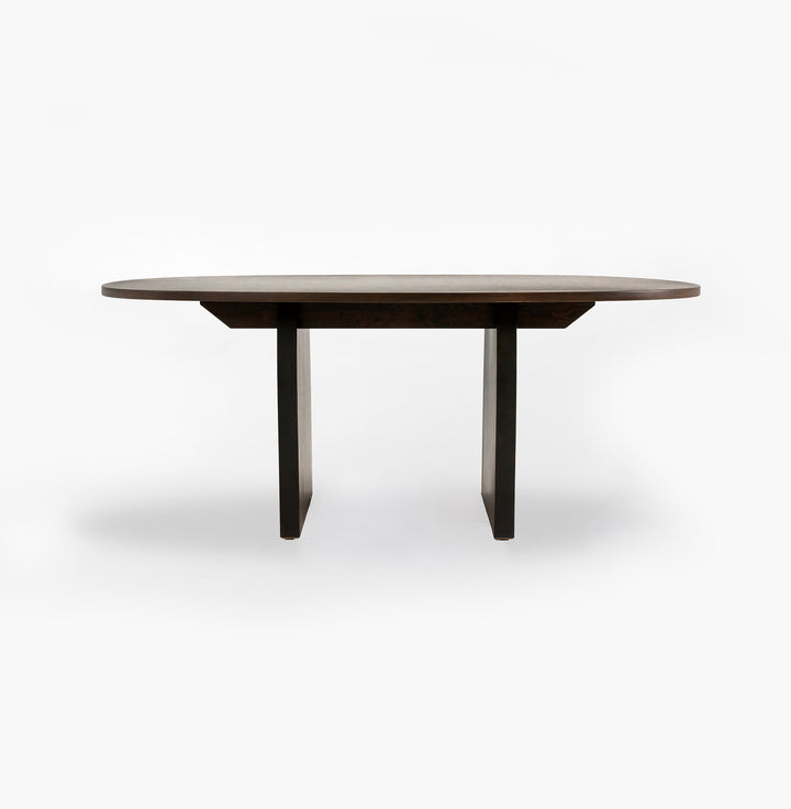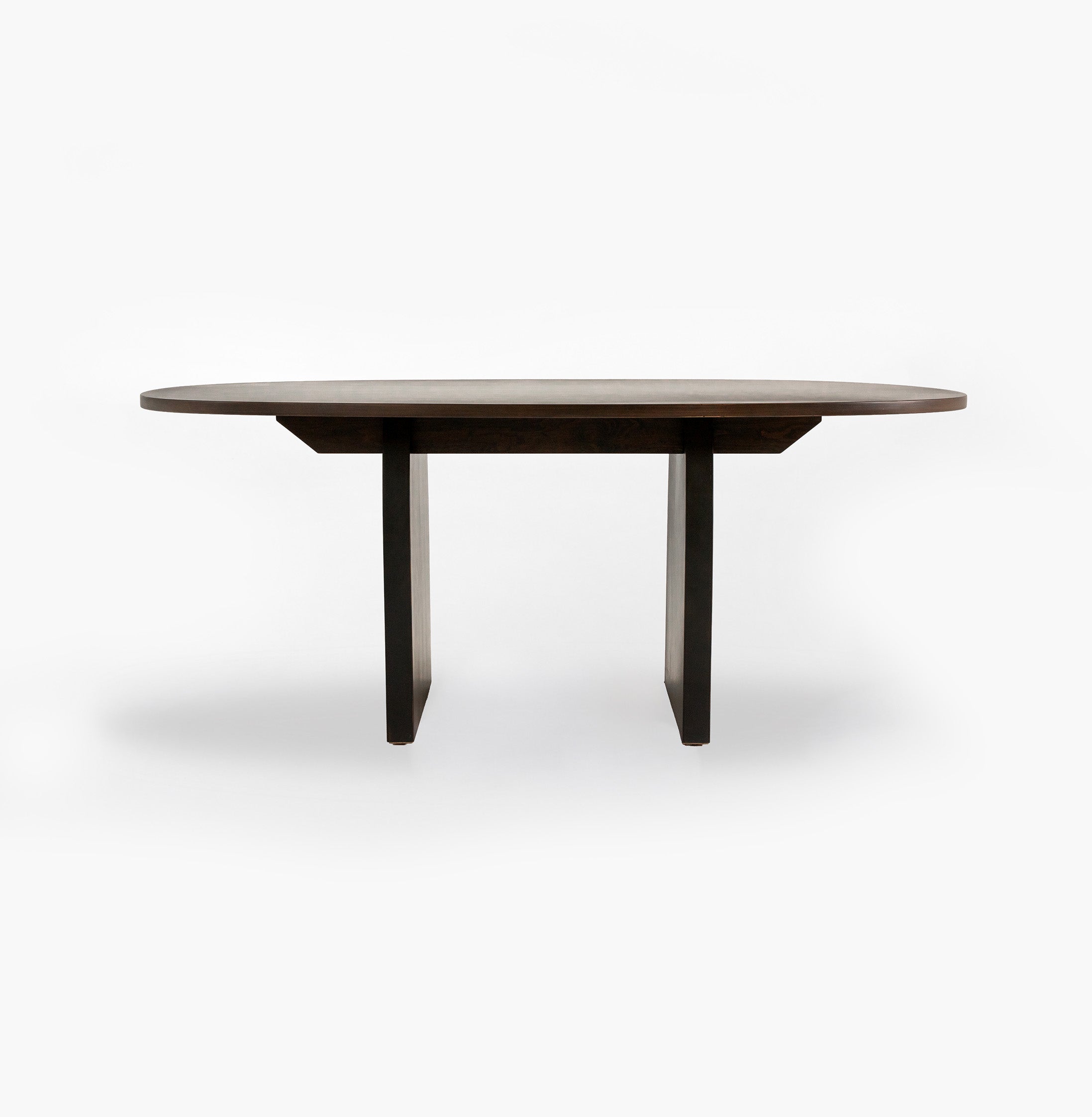 Mesa de comedor de diseño contemporáneo fabricada en madera con acabado en chapa de encino de 2mm fondo de poliuretano para mayor resistencia que destaca por su base estructural compuesta por dos soportes verticales curvos enfrentados y refuerzos diagonales que brindan estabilidad. Su cubierta ovalada con esquinas redondeadas y canto delgado aporta una estética minimalista y elegante, ideal para espacios modernos.