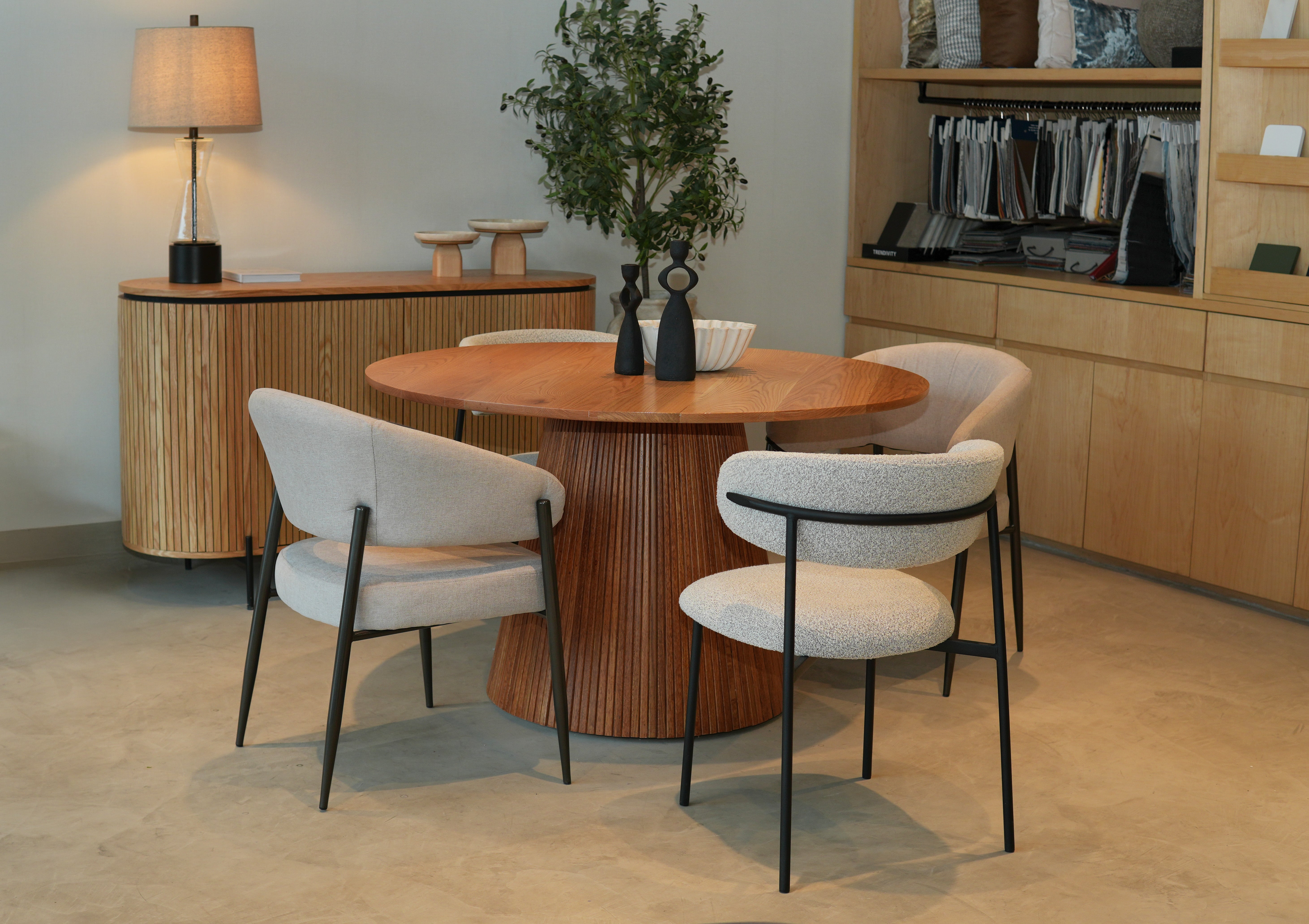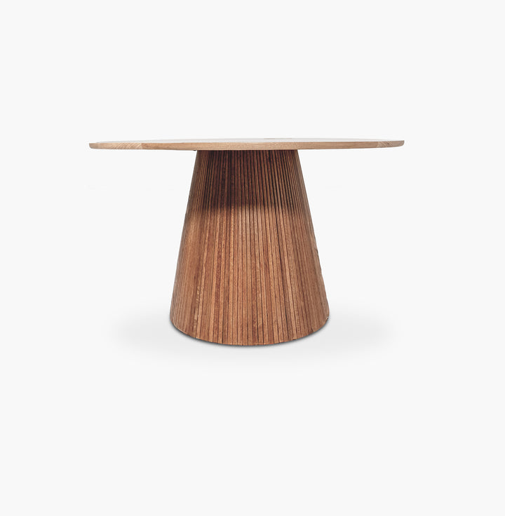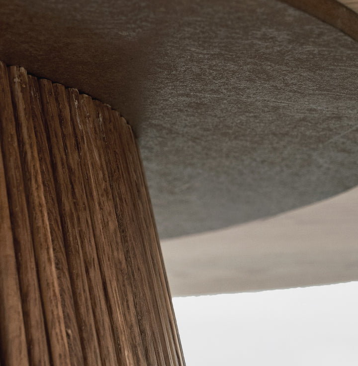 Esta mesa destaca por su diseño elegante y contemporáneo, combinando la calidez de la madera con una silueta moderna y sofisticada. Su base estructurada en madera de pino presenta un acabado detallado en listones verticales que aportan textura y movimiento visual, mientras que su cubierta, protegida con poliuretano de alta resistencia, garantiza durabilidad y fácil mantenimiento. Perfecta para ambientes modernos, naturales o minimalistas, esta pieza se convierte en el punto focal ideal de cualquier espacio, aportando equilibrio entre funcionalidad y estilo.