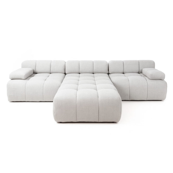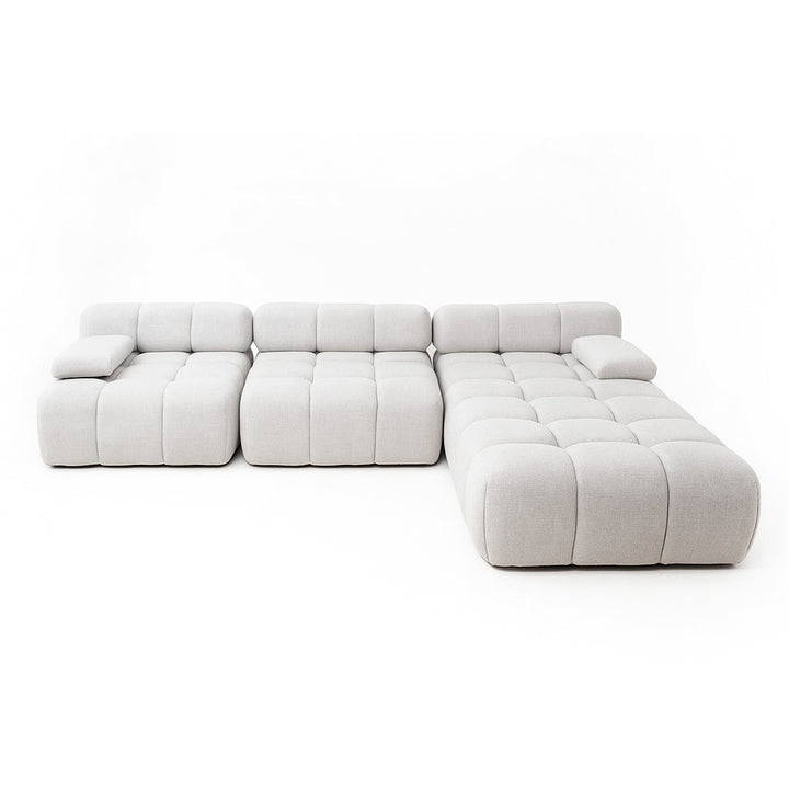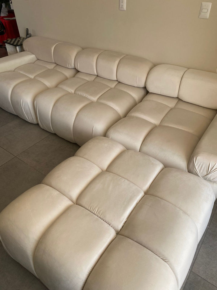 Cada módulo presenta un diseño acolchado con costuras en forma de cuadrícula, que le dan un aspecto mullido y una textura visual interesante. Los asientos y los respaldos son anchos y generosos, invitando a la relajación.