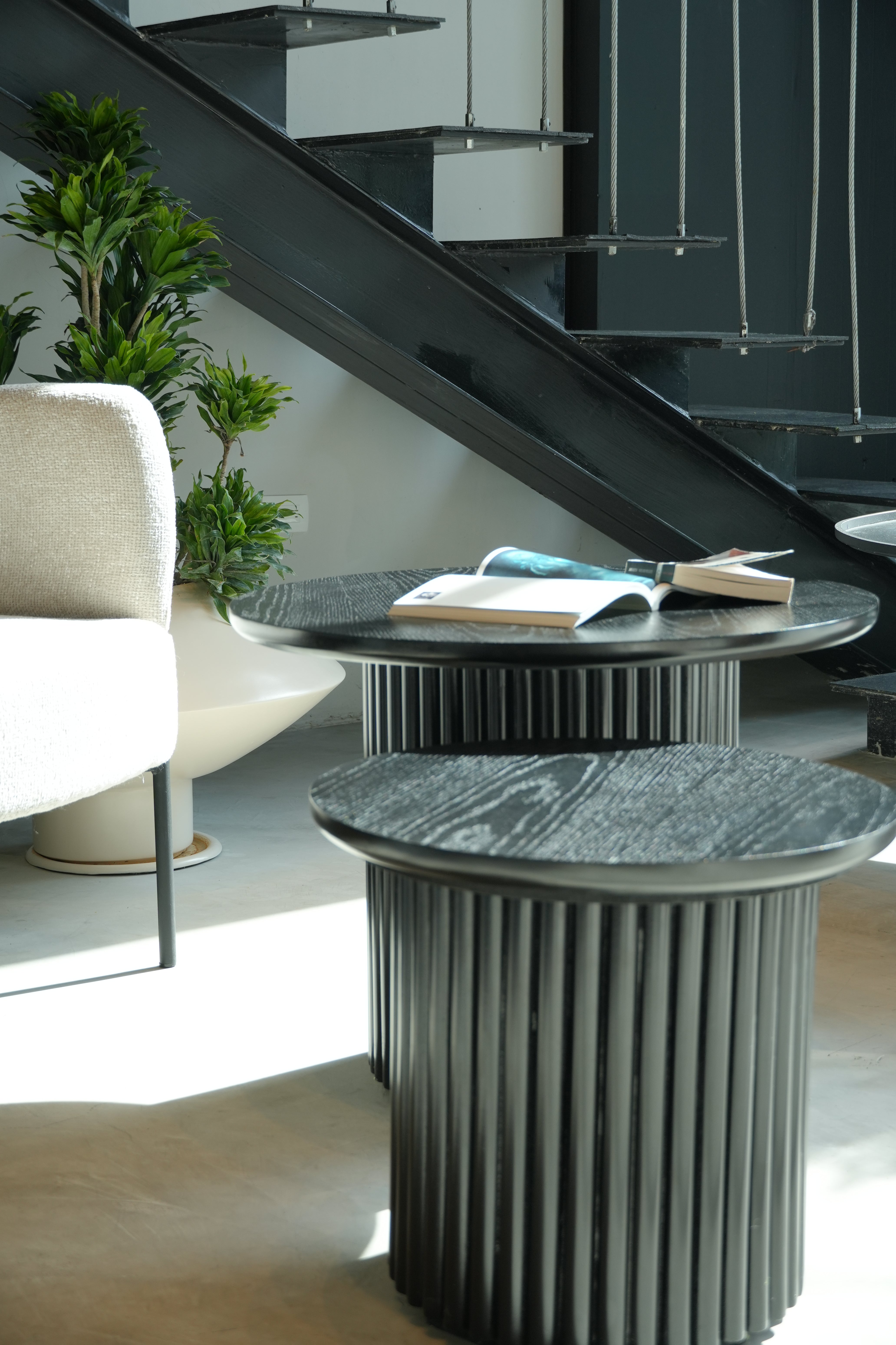 Este set de mesas combina diseño contemporáneo y versatilidad en una pieza funcional y elegante. Su base cilíndrica en MDF presenta un acabado acanalado que aporta textura y carácter, disponible en una amplia gama de colores para personalizar según tu estilo.