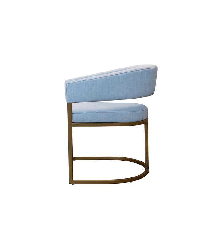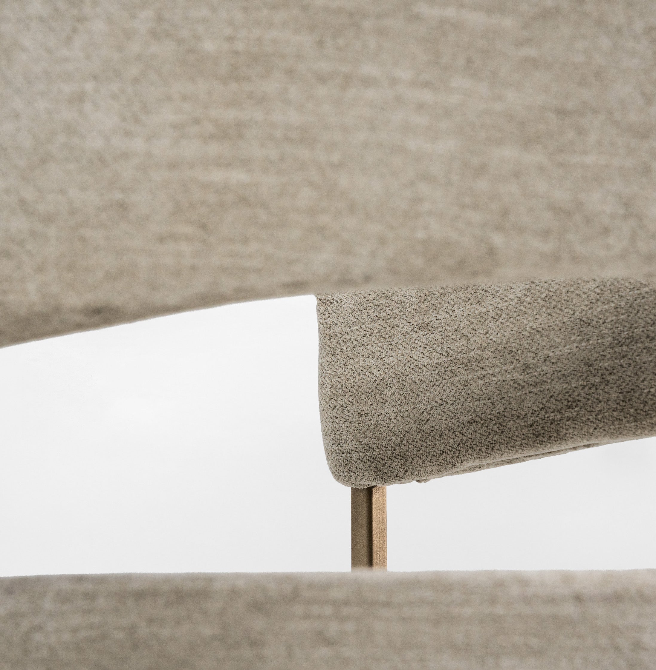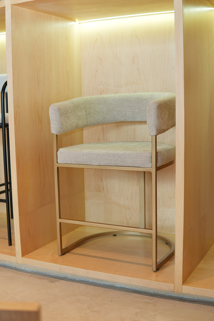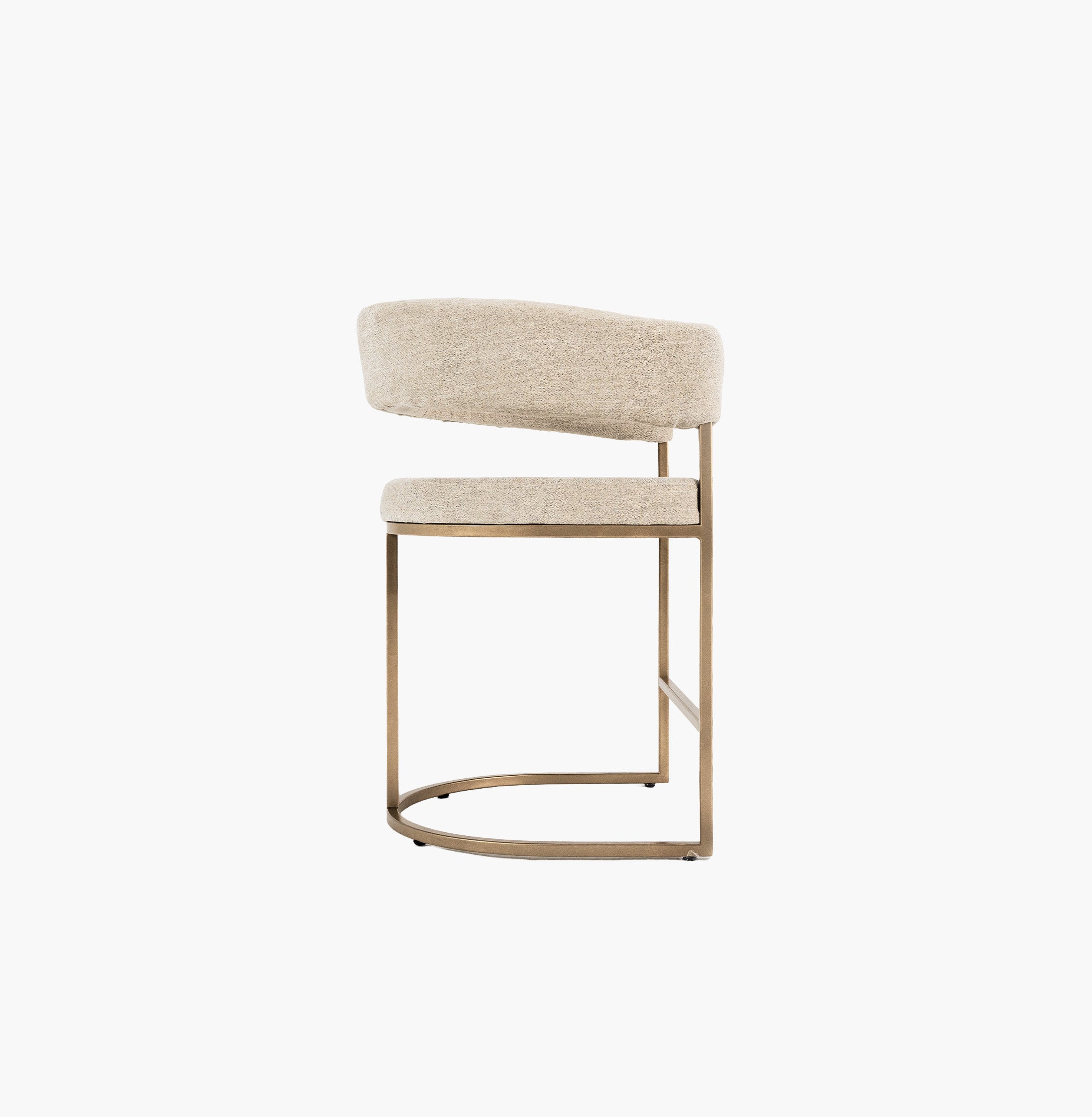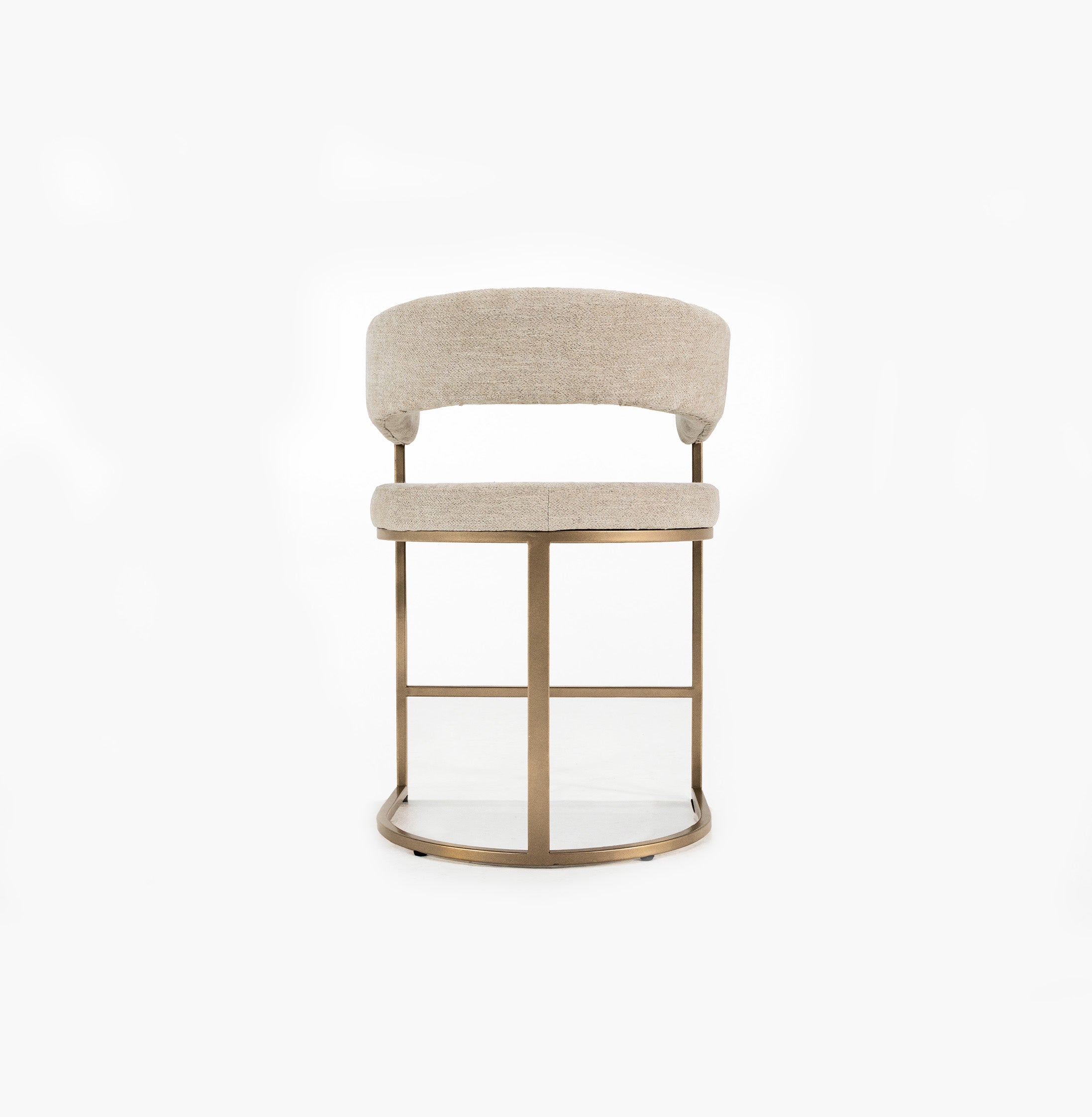 Base fabricada en herrería con acabado electrostático en color oro, que aporta un toque de sofisticación y estilo contemporáneo. El diseño se complementa con un bastidor en madera sólida de pino, tapizado en la tela de tu elección, ofreciendo un equilibrio perfecto entre resistencia, confort y estética.