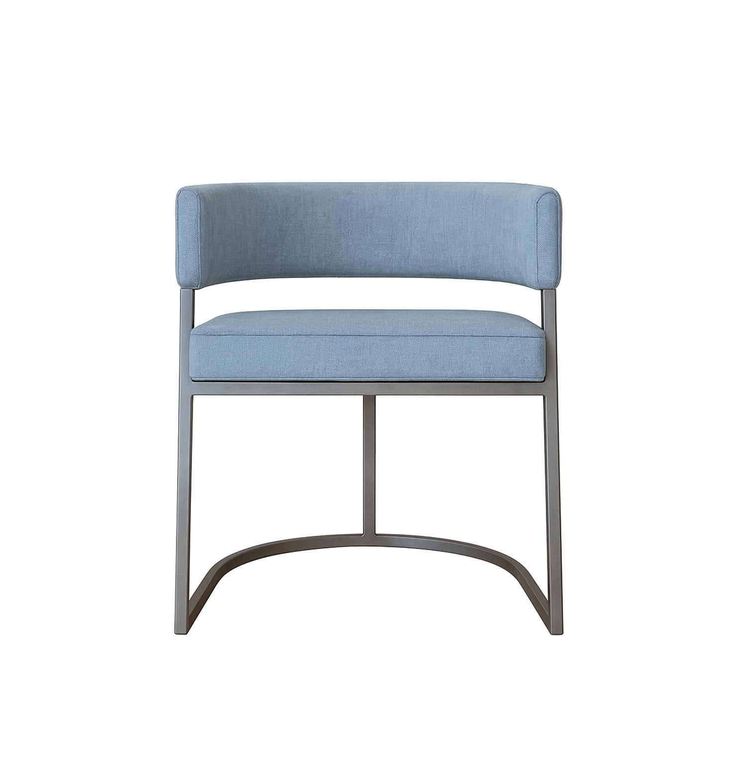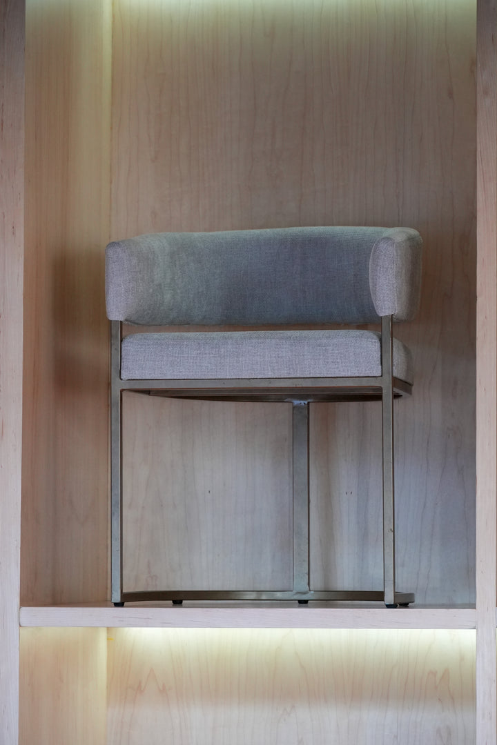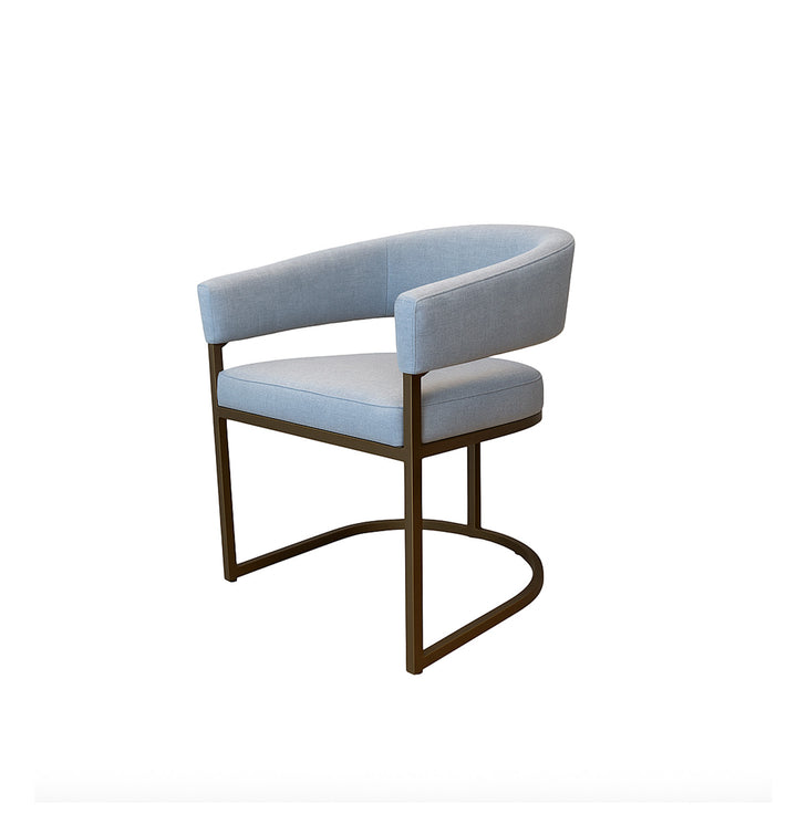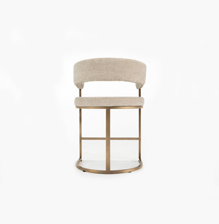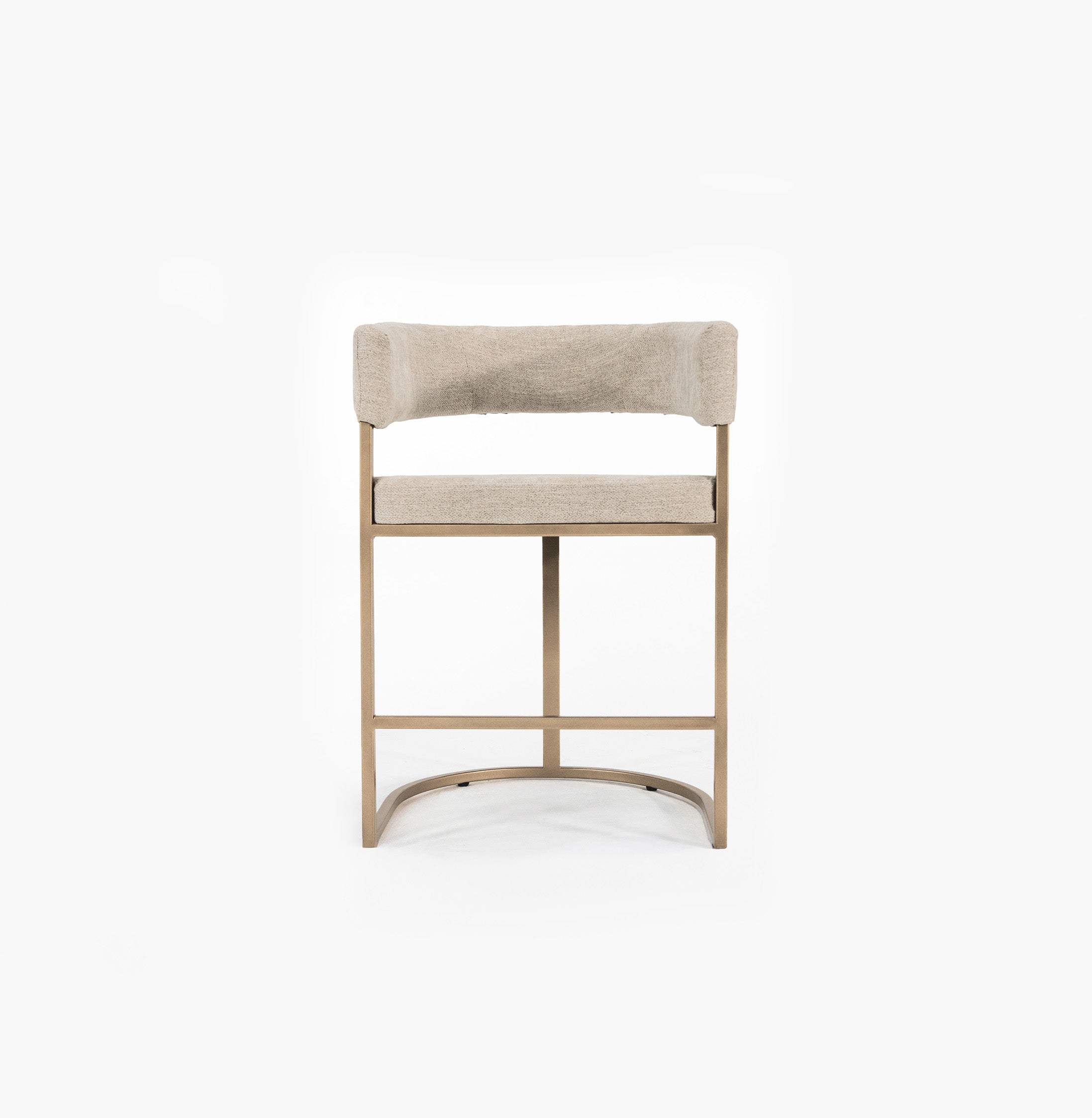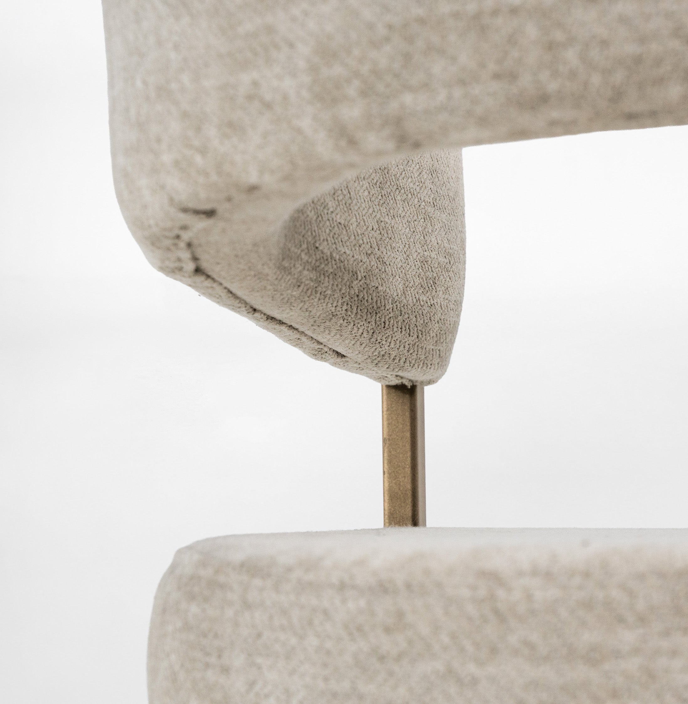 Base fabricada en herrería con acabado electrostático en color oro, que aporta un toque de sofisticación y estilo contemporáneo. El diseño se complementa con un bastidor en madera sólida de pino, tapizado en la tela de tu elección, ofreciendo un equilibrio perfecto entre resistencia, confort y estética.