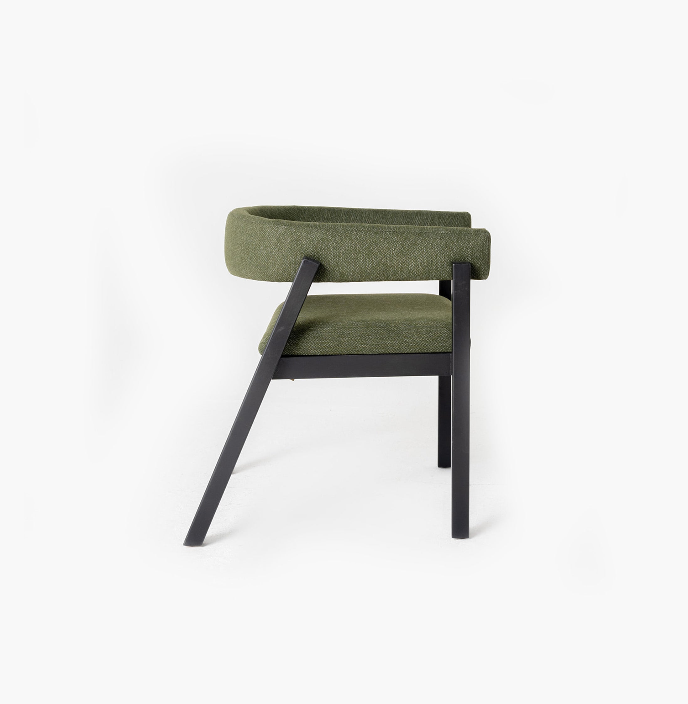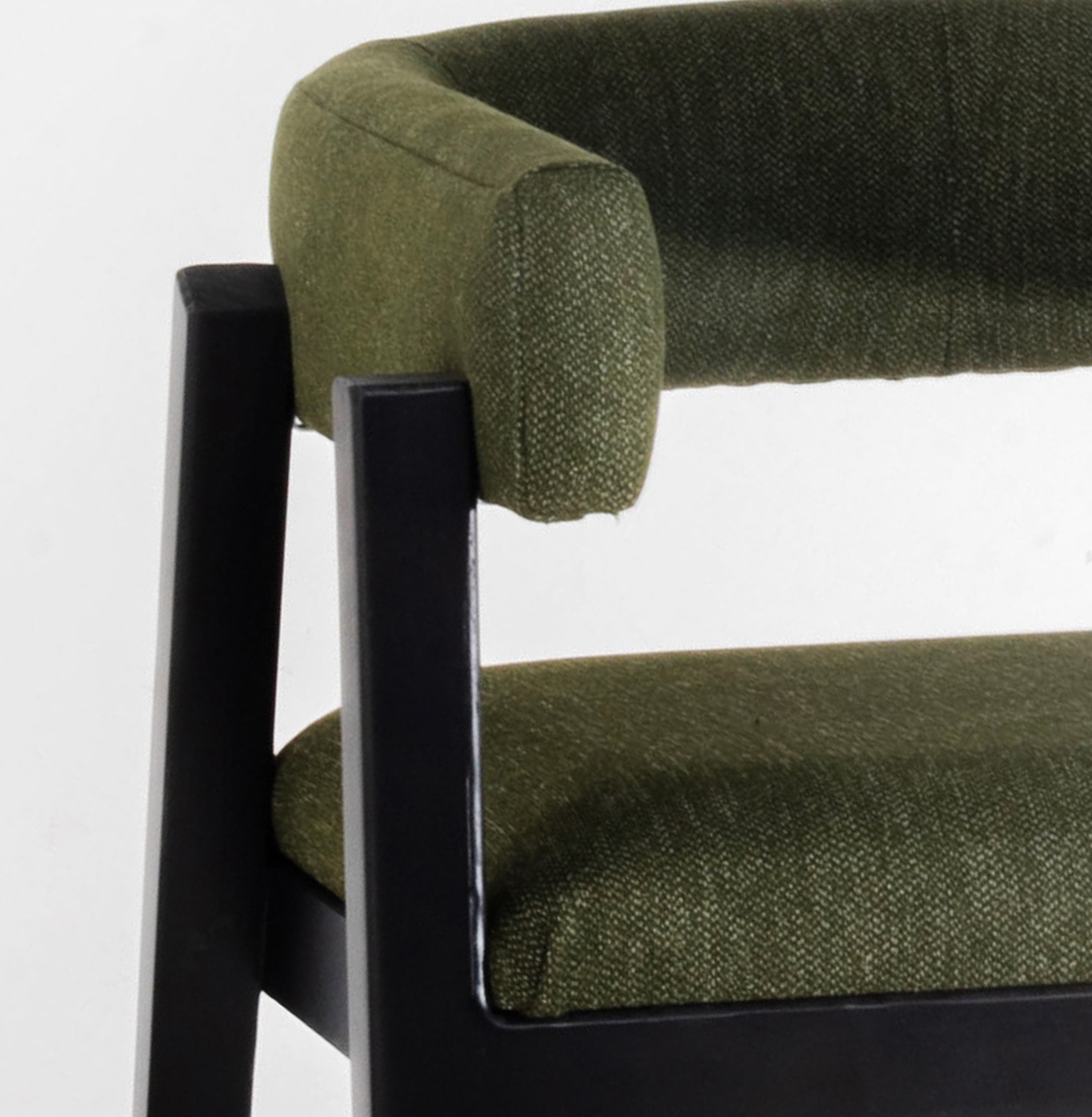 Estructura principal fabricada en madera de haya, reconocida por su resistencia y belleza natural. El asiento y respaldo están construidos con estructura interna de pino, rellenos de espuma de alta densidad que garantiza confort y durabilidad. Ambos elementos están tapizados en tela a elección del cliente, permitiendo personalizar el diseño según el estilo y la atmósfera del espacio.