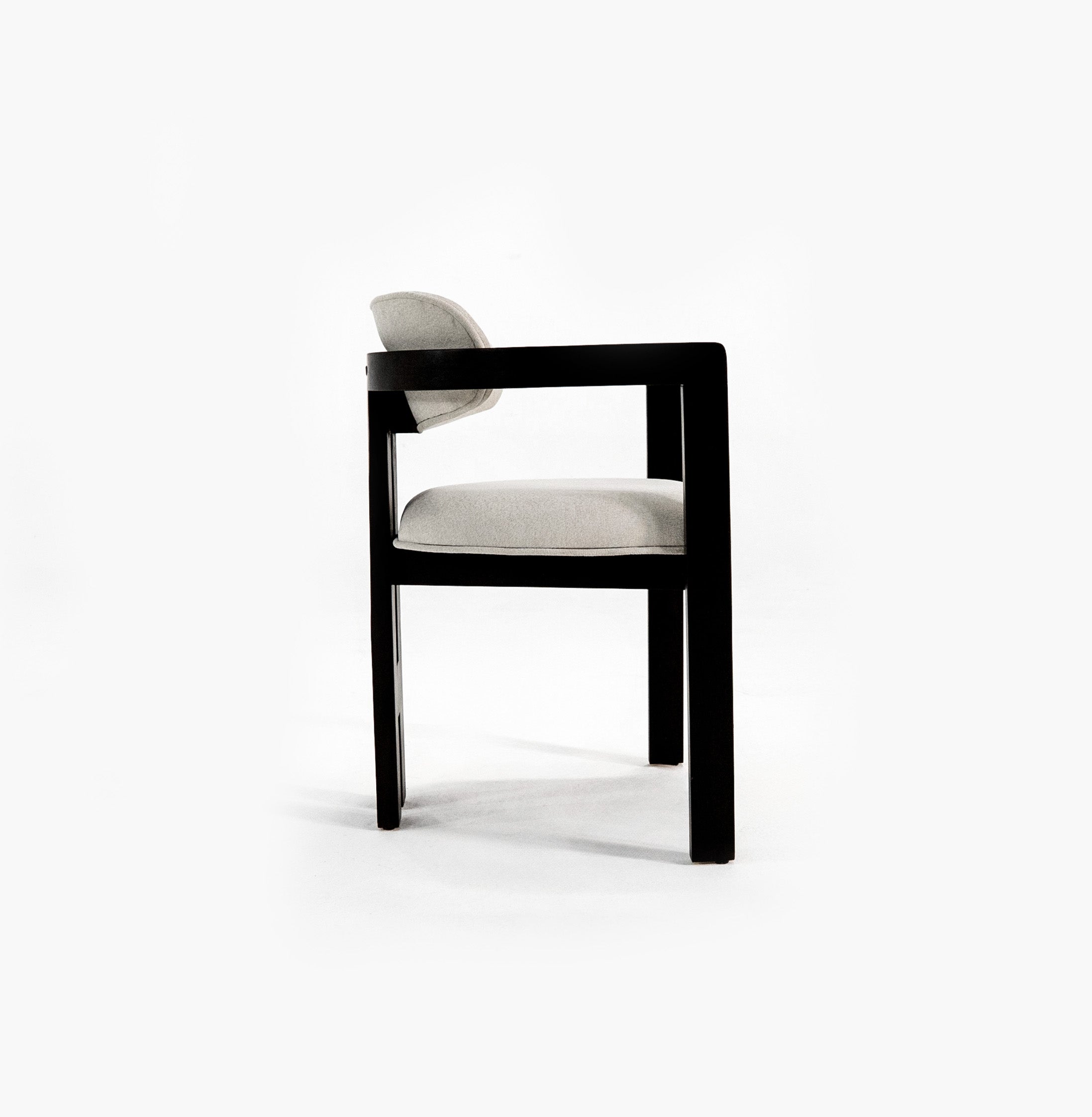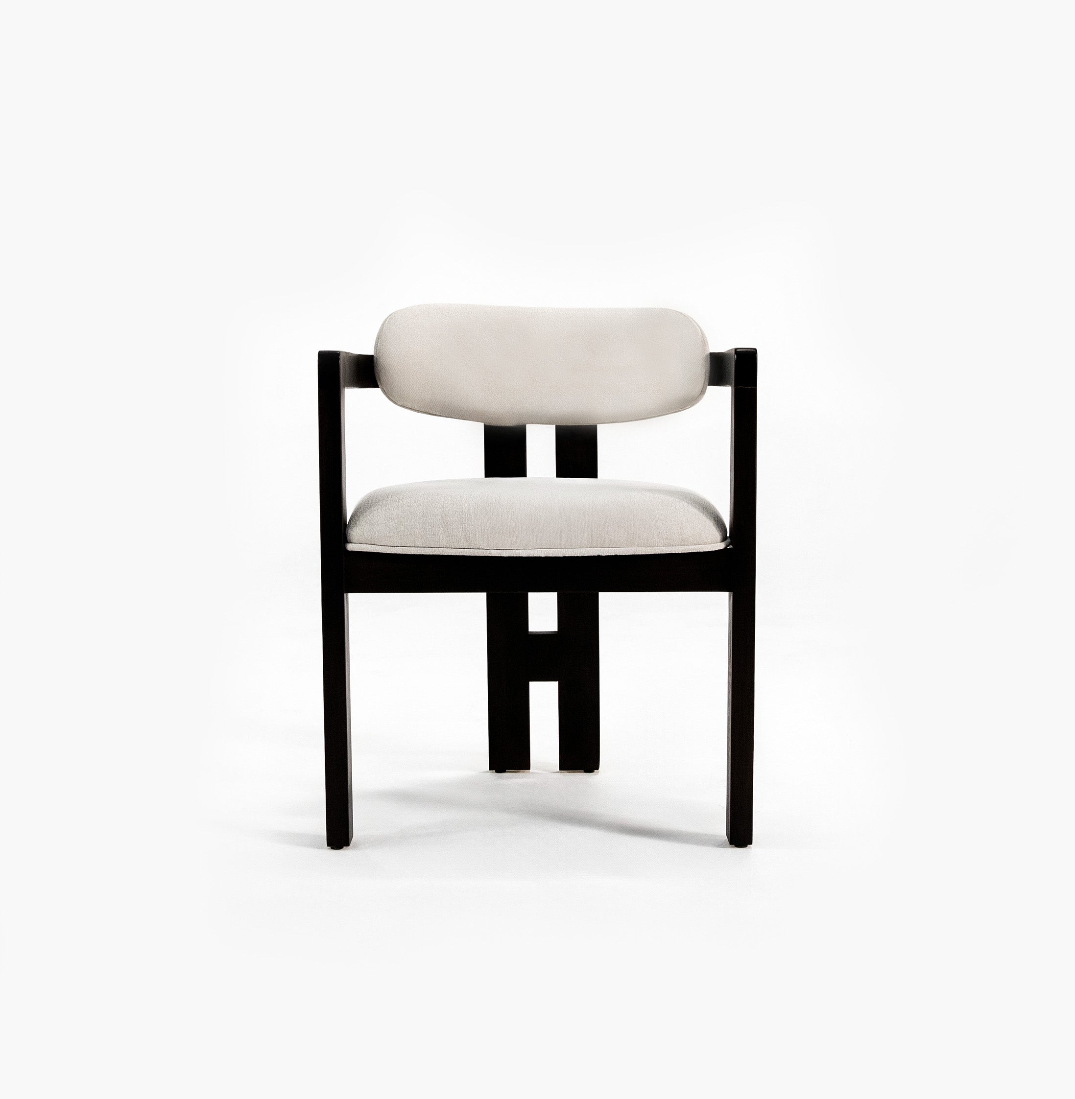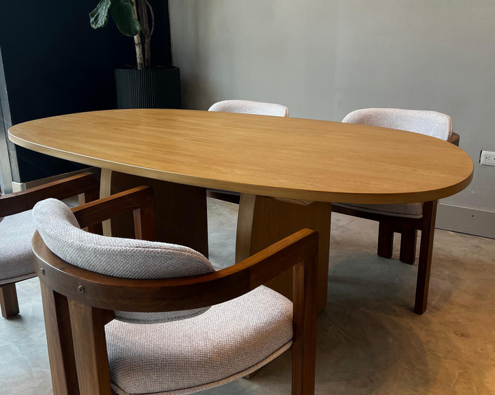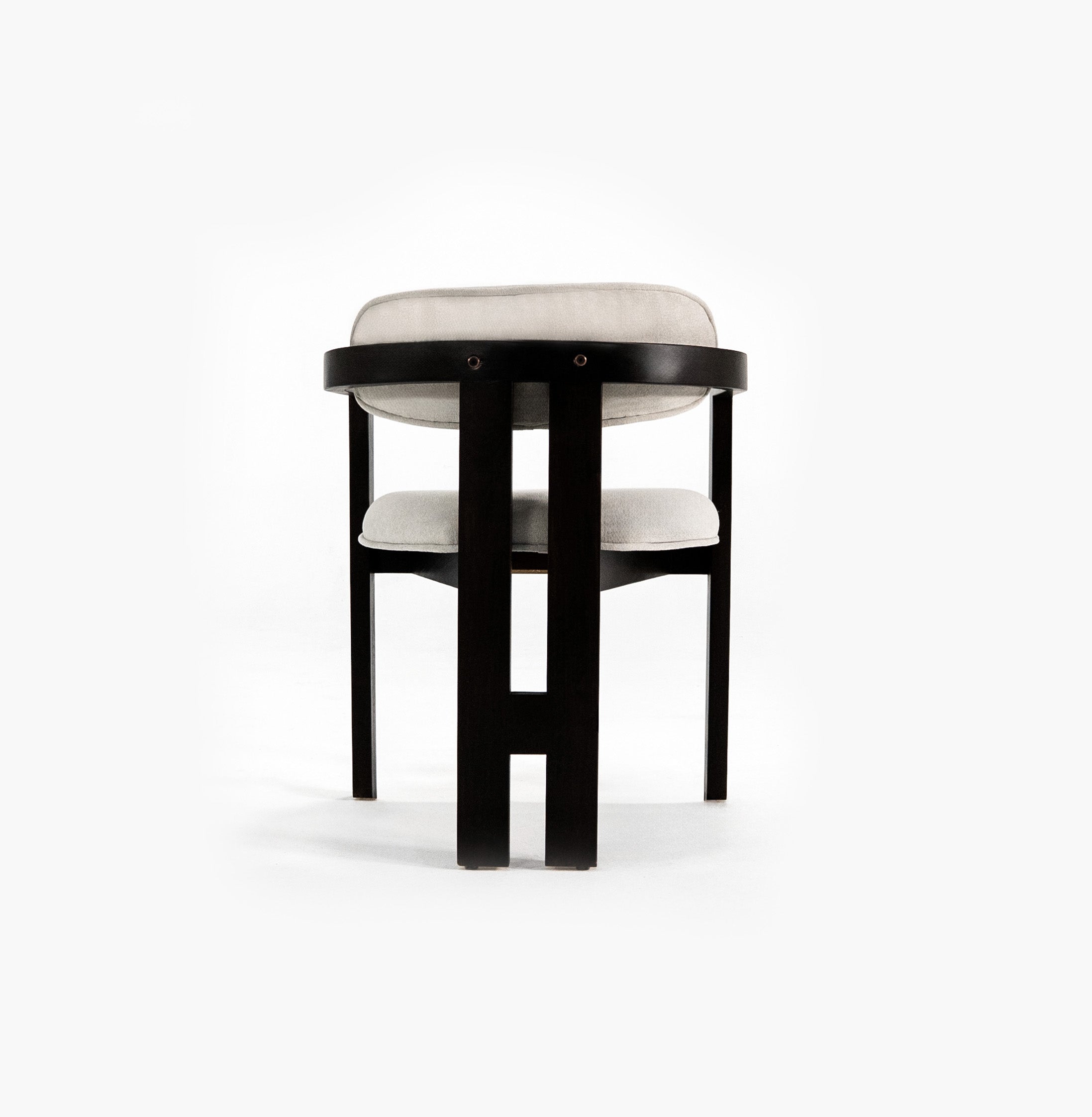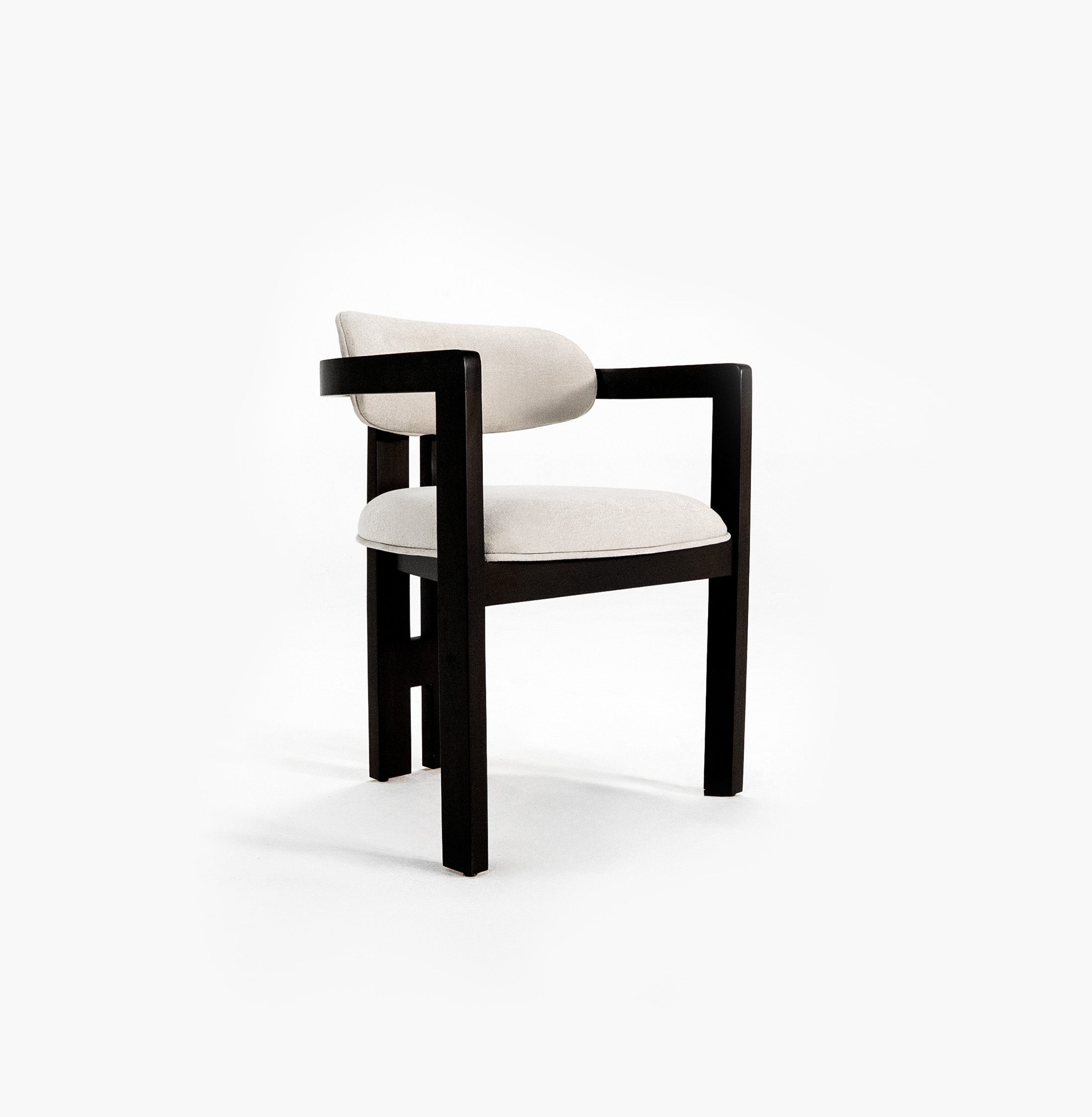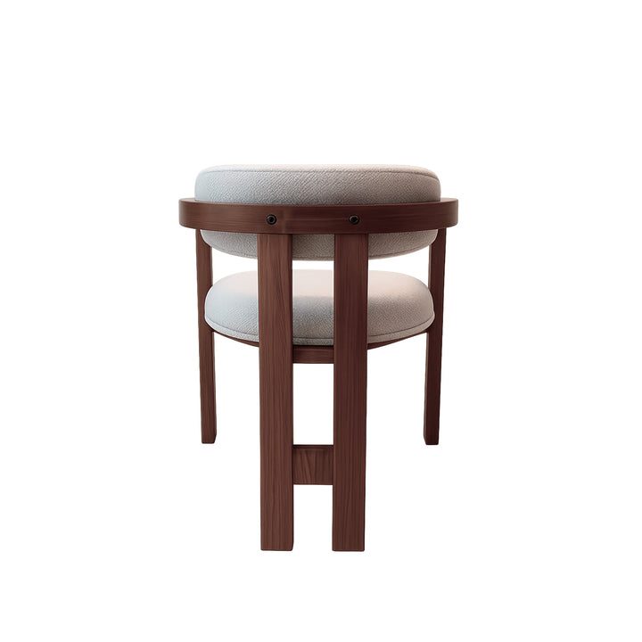 Esta silla cuenta con una estructura de madera sólida con acabado cálido y natural, diseñada con respaldo curvo y soportes verticales dobles en la parte trasera para mayor estabilidad. El asiento y el respaldo están tapizados en una tela bouclé color beige claro, de textura densa y uniforme, que aporta comodidad y resistencia. La parte trasera muestra un diseño limpio y simétrico, ideal para espacios con estética artesanal.