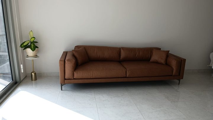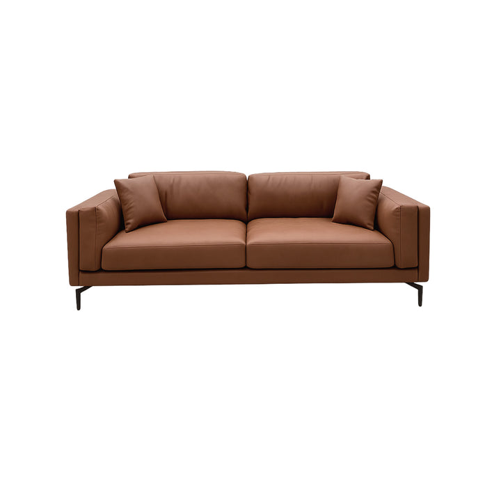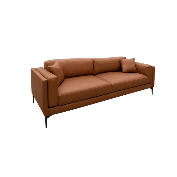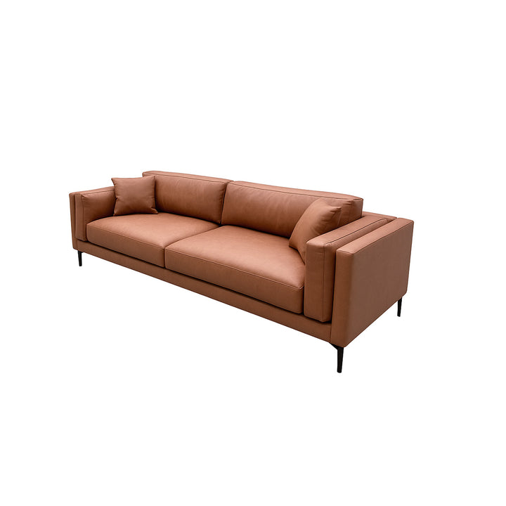 Este sofá de tres plazas presenta un diseño contemporáneo de líneas rectas y proporciones equilibradas, tapizado en piel sintética color cognac con acabado mate y textura suave tipo cuero. Su estructura interna está fabricada en madera de ingeniería reforzada, lo que garantiza durabilidad y resistencia, mientras que los cojines de asiento y respaldo están rellenos con espuma de alta densidad para mayor comodidad y soporte. Los brazos del sofá, de tipo recto y acolchonados, están a la misma altura que el respaldo, generando una silueta uniforme y moderna. Se apoya sobre patas delgadas de metal con acabado negro mate, que elevan la pieza y aportan un toque industrial sin sacrificar estabilidad.