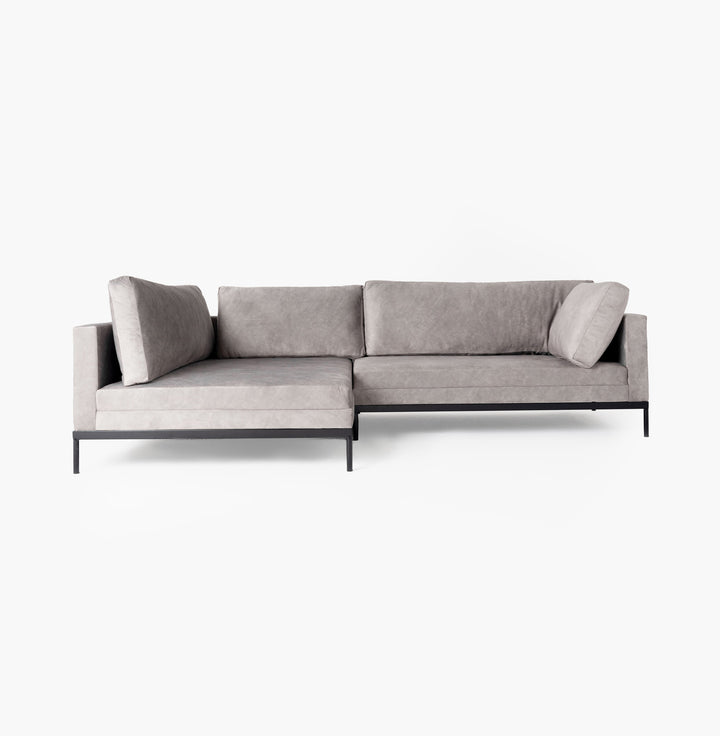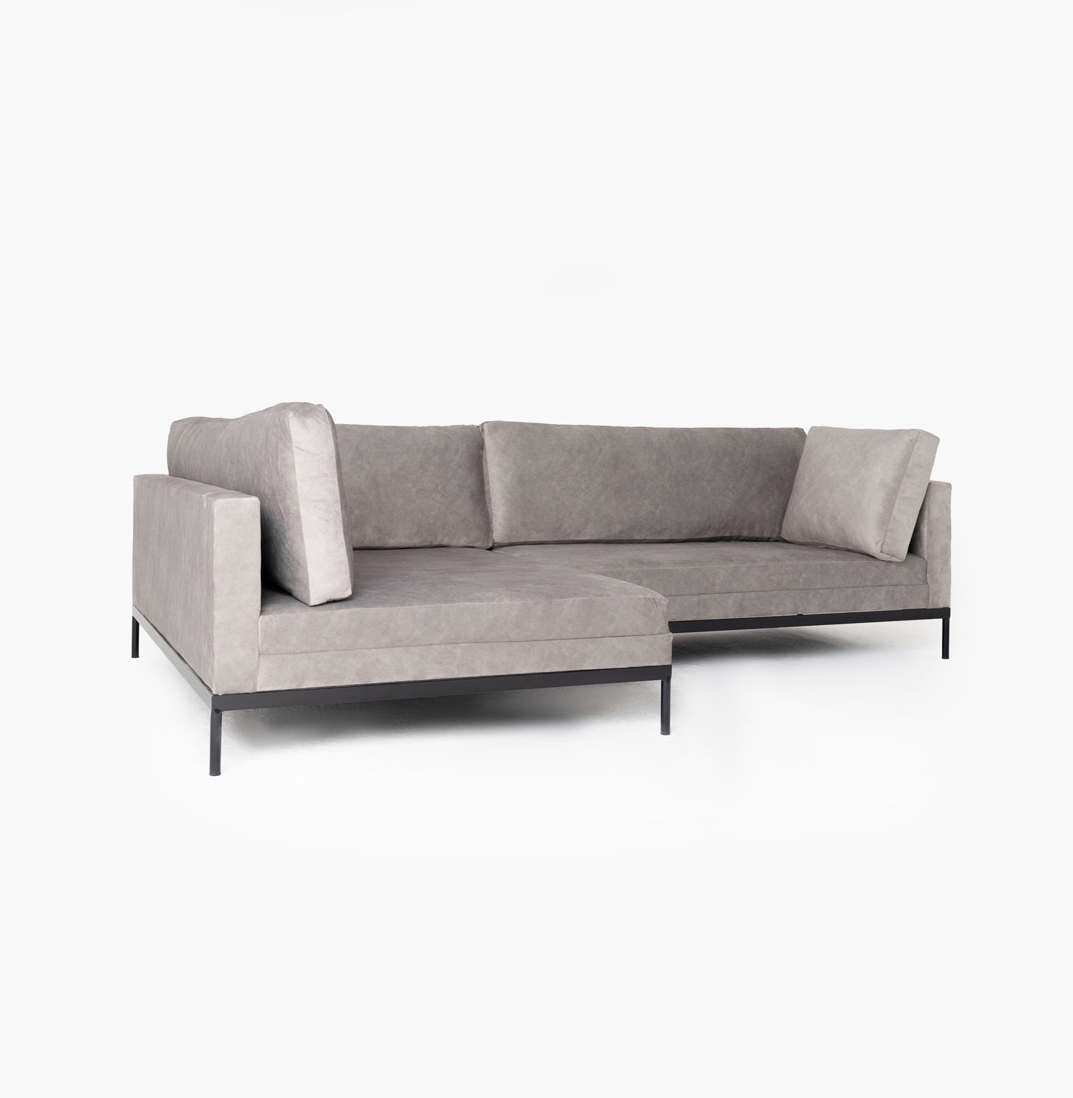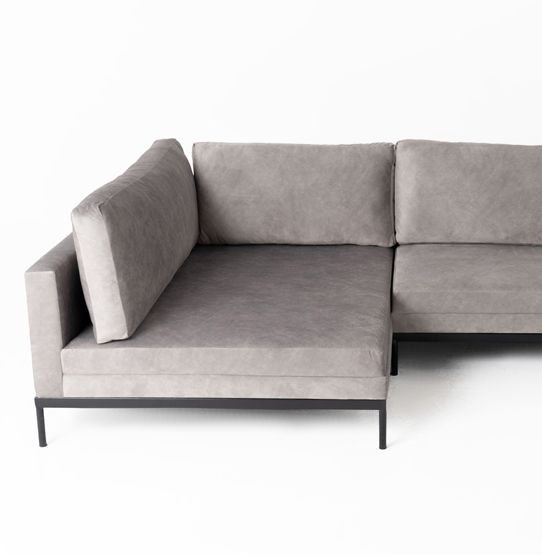 Sofá modular con chaise longue, diseñado para ofrecer un equilibrio perfecto entre estilo minimalista y máximo confort. Su estructura de líneas rectas y limpias se apoya sobre una elegante base de acero con patas delgadas en color negro, creando una sensación de ligereza y modernidad en cualquier espacio.