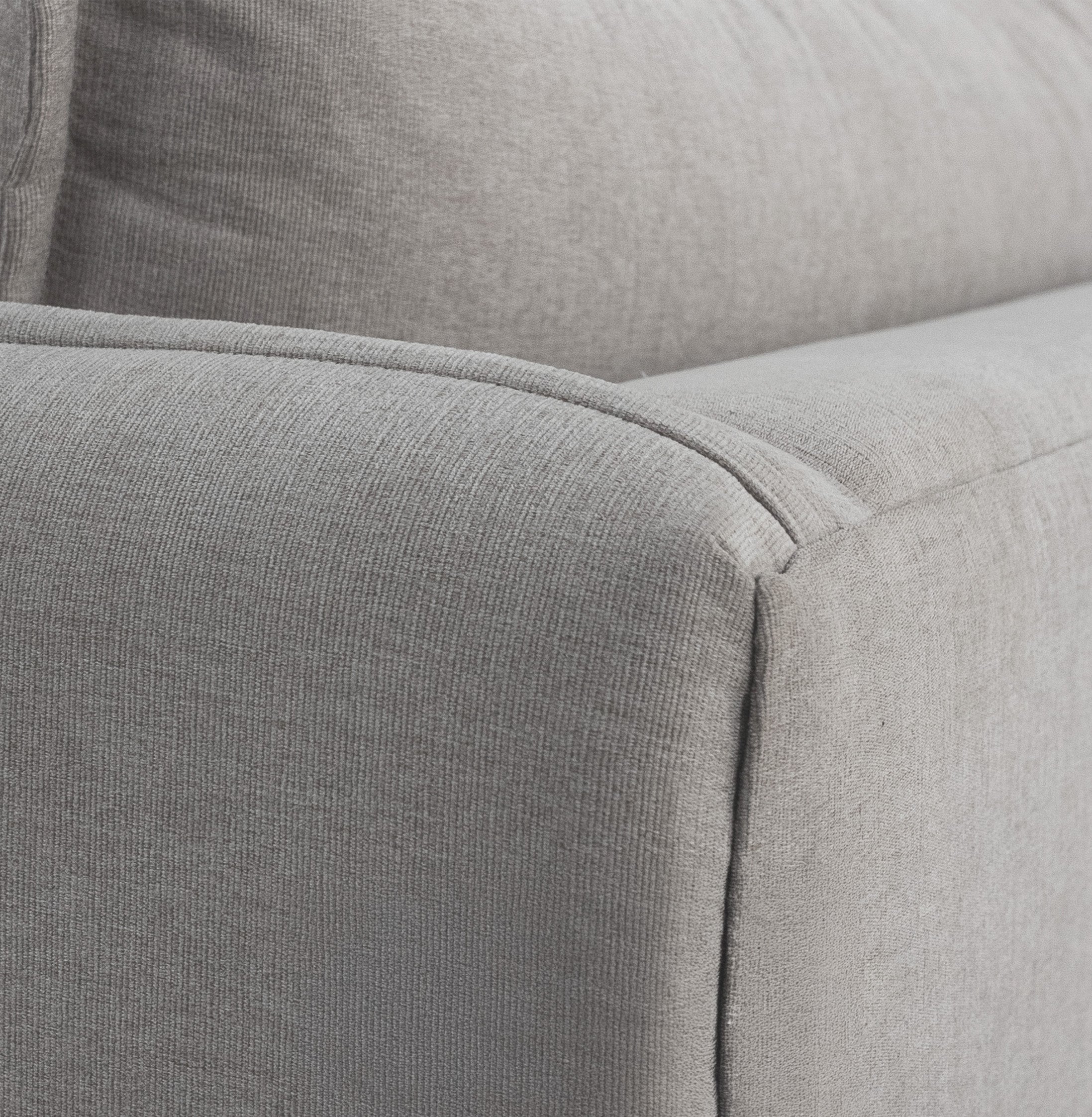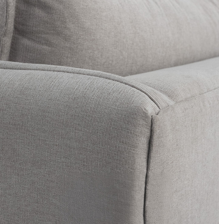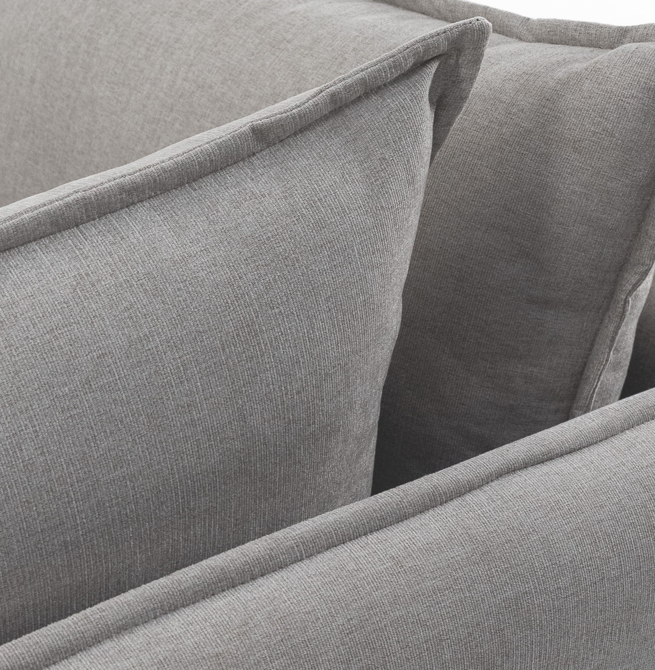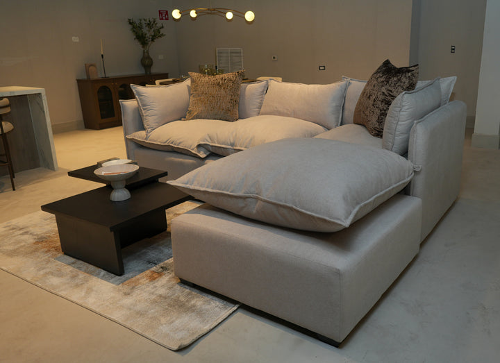 Este sofá tipo chaise longue puede fabricarse en versión modular, adaptándose al espacio y necesidades de cada cliente. Está tapizado en tela de color y textura a elección, con una base robusta de líneas rectas y cojinería de gran volumen que parece suelta, rellena con espuma de alta densidad para ofrecer un confort envolvente tipo pillow top. El taburete añade versatilidad y comodidad al sentarse, mientras que su diseño sin patas visibles aporta una estética moderna y acogedora.